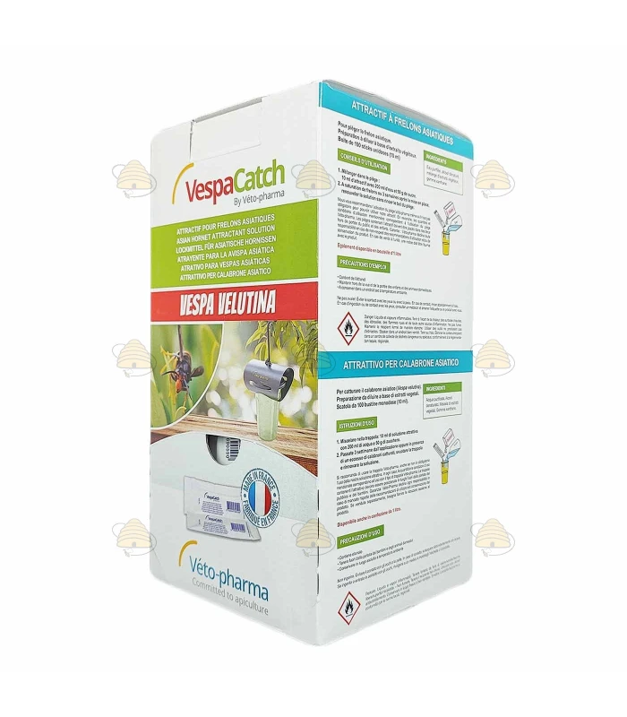 VespaCatch lure in a convenient 10 ml sachet (100 pcs - 1 box) is a plant-based attractant specifically designed not to attract bees, maximizing the capture of Asian hornets. It comes in a box with 100 sachets.