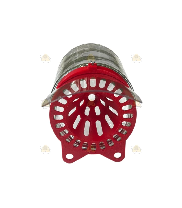 Hornet trap supplied in red or yellow, including glass jar. This simple hornet trap is designed for horizontal use. Add the lure on a small piece of sponge in the jar, screw on the hornet entrance, and place the jar on a hornet flight path.