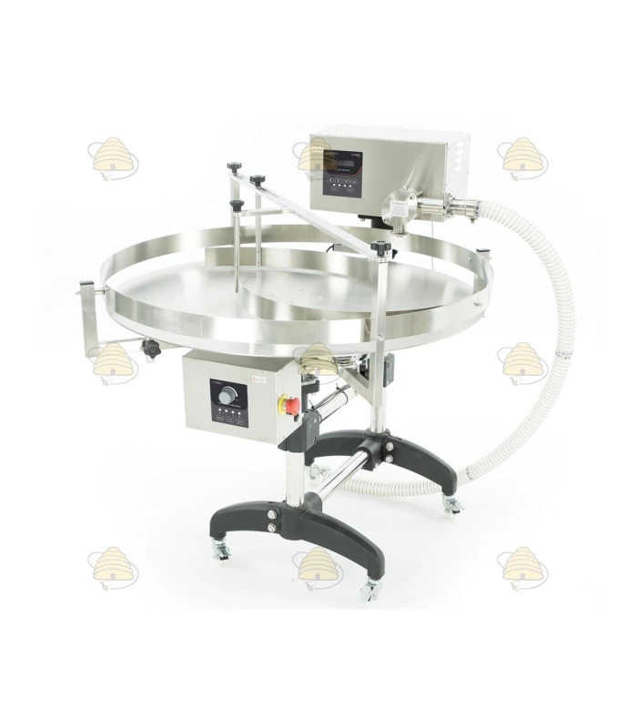 This stainless steel filling table Premium, with a honey pump, is ideal for dosing honey into jars. This "Premium" edition means high quality and a simple, practical control system. The filling and pumping mechanism is made of food-grade plastic where components come into contact with the honey and is easy to clean. The turntable has a diameter of 90 cm and responds to the sensor on the filling pump. When you place the jars on the filling table, they automatically rotate toward the filling pump until a jar is under the sensor. The unit is 82 cm high. The machine can also be used as a honey pump.