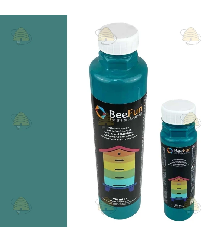 Sea green paint for painting a polystyrene/plastic beehive. This includes beehives made of polystyrene, EPS, 'styrofoam' etc. (This paint is not suitable for wooden beehives, choose our natural paint instead). This paint, specially for 'styrofoam' beehives has a beautiful, natural sea green color and for painting 1m² you need about 100 ml of paint (250ml = 2.5m² and 750 = 7.5m²). By diluting the paint with white paint, you can create multiple color shades. The paint can also be diluted with a maximum of 10% water for a first coat. For a beautiful result, it is advised to apply multiple layers with a brush, roller or by spraying. Besides being suitable for plastic beehives, it can also be used for coloring walls and ceilings. Make a choice between a quantity of 250 ml and 750 ml in the selection field below.