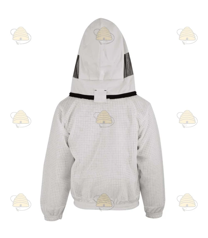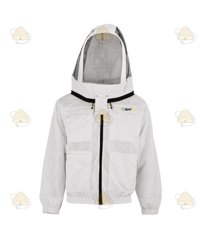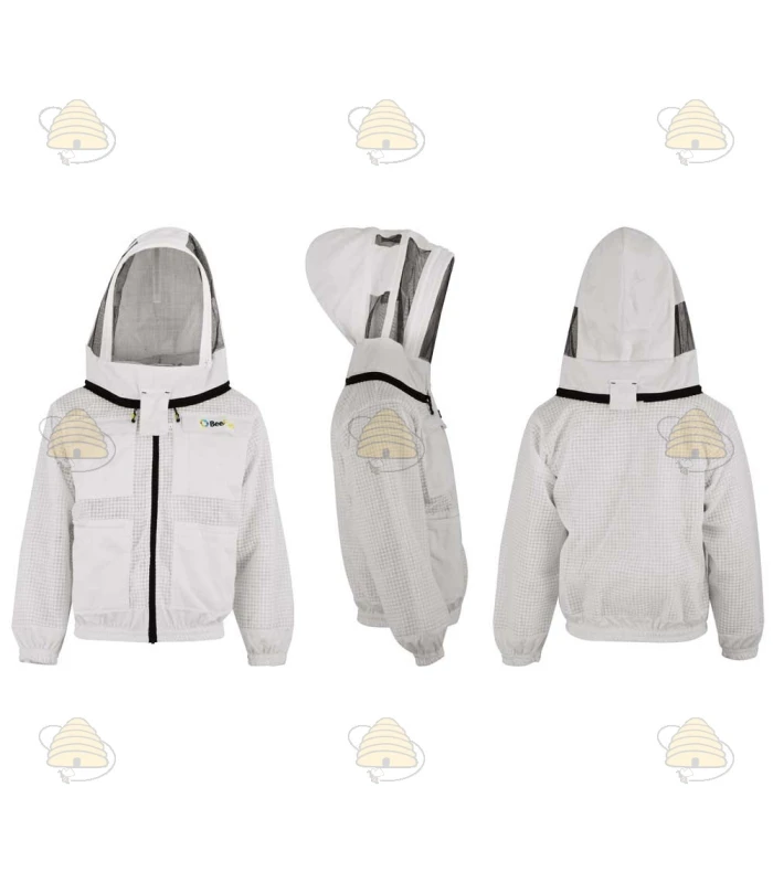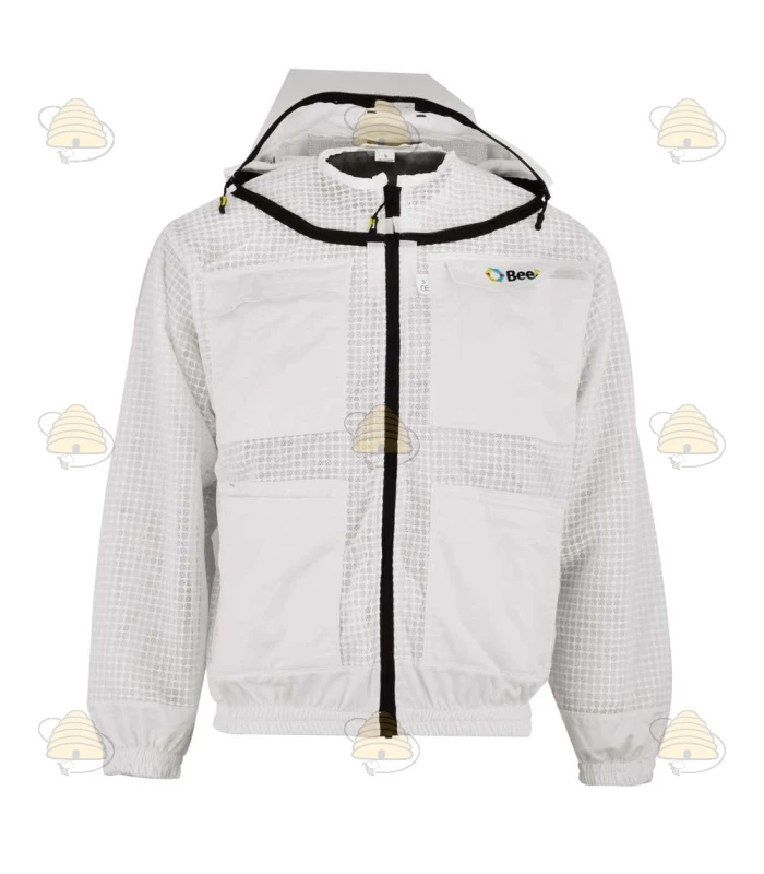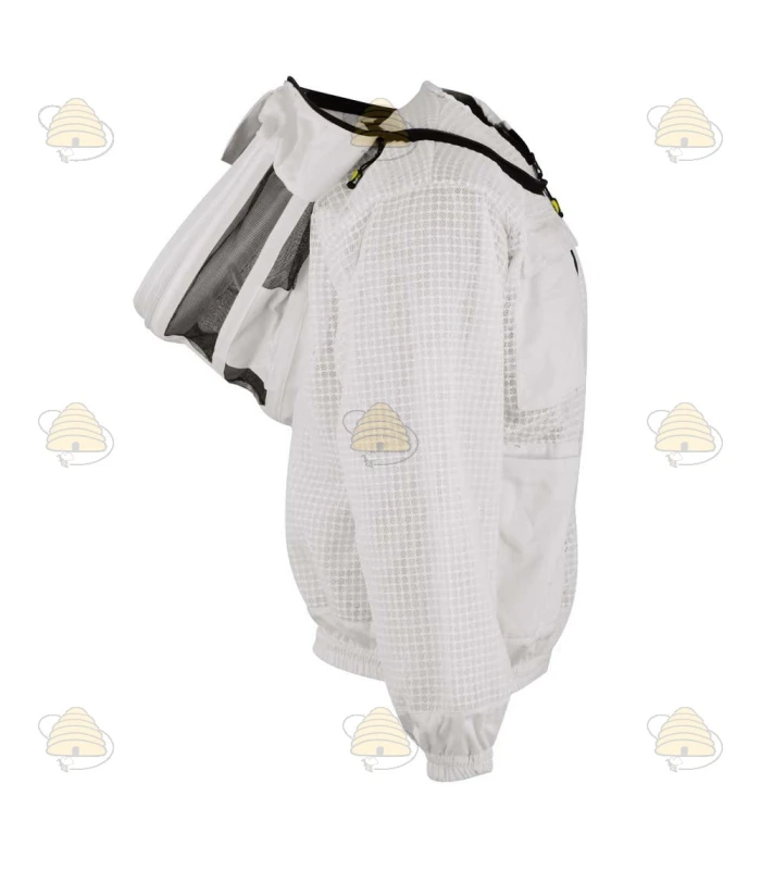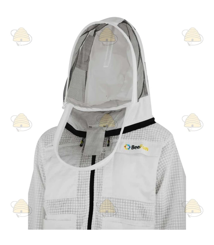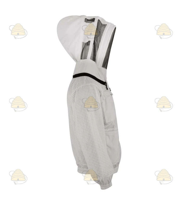 Beekeeping jacket 'AirFree' Deluxe with fencing veil is made of 3 layers: a fine inner and outer mesh fabric and a spacer layer that prevents a bee’s stinger from reaching the skin. This lets air move freely through the jacket while bees still can’t sting through it. The jacket features two pockets and a chest pocket. It also has two high-quality zippers with fun BeeFun pull cords—one on the front and one on the veil (the veil can be zipped off). You can put it on like a regular jacket. The zippers (premium YKK quality) have overlapping fabric with Velcro at the ends so not a single bee can get inside. A comfortable, robust jacket!