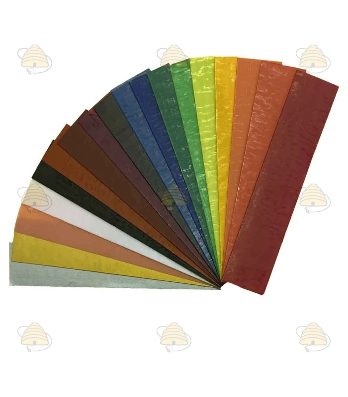 Set of colored beeswax strips for decorating a candle. The set contains 18 beeswax strips in the colors dark red, signal red, orange, (Imkershop)yellow, yellow, light green, green, dark blue, blue, dark purple, pink, dark brown, light brown, black, white, salmon pink, gold and silver. Each strip measures 20 x 4 cm. With the warmth of your hands you can easily shape the wax as desired. You can also cut shapes from the wax and apply them to a candle.
