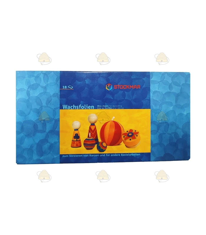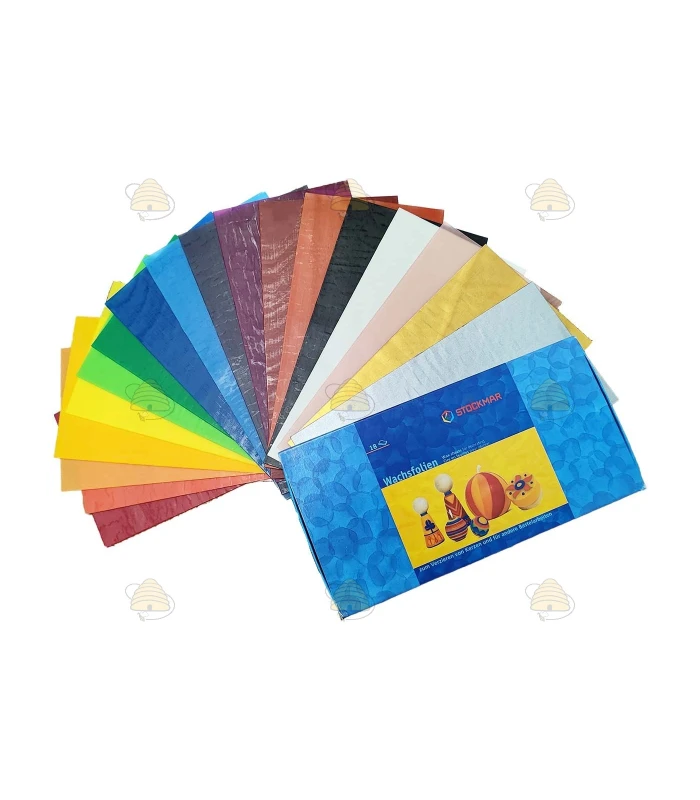 Pack of colored beeswax sheets for decorating a candle. The pack contains 18 beeswax sheets in the colors dark red, signal red, orange, (Imkershop) yellow, yellow, light green, green, dark blue, blue, dark purple, pink, dark brown, light brown, black, white, salmon pink, gold and silver. Each sheet measures 20 x 10 cm. With the warmth of your hand you can easily work the wax into the desired shape. You can also cut shapes from the wax and apply them to a candle.