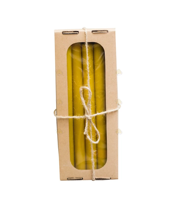 Beautiful set of 4 dinner taper candles made of beeswax. This candle tapers slightly towards the top, as is typical for a taper. At the base, the candle is approximately 2 cm in diameter and it is 25 cm long. The set comes in a beautiful gift box with a bow. The ideal gift for any lover of beeswax candles. Burn time is more than 6 hours per candle.