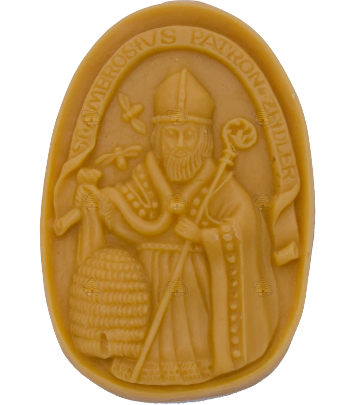 Beautiful beeswax plaque featuring Saint Ambrose, the patron saint of beekeepers. The plaque weighs between 150 grams and 400 grams and is made from local (organic) beeswax.