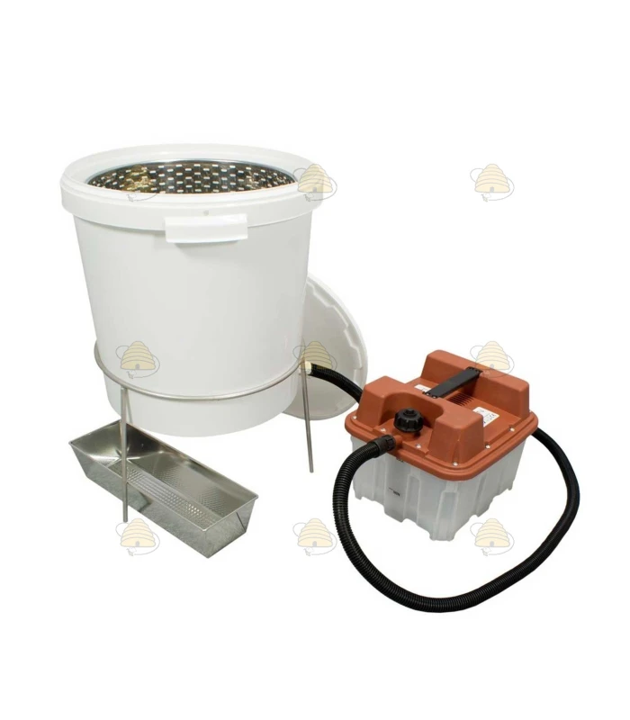 Steam wax melter with plastic tank. A complete set for melting wax from hive frames. It operates on steam. Particularly suitable for melting cut-out honeycomb; complete frames do not fit in the plastic tank.