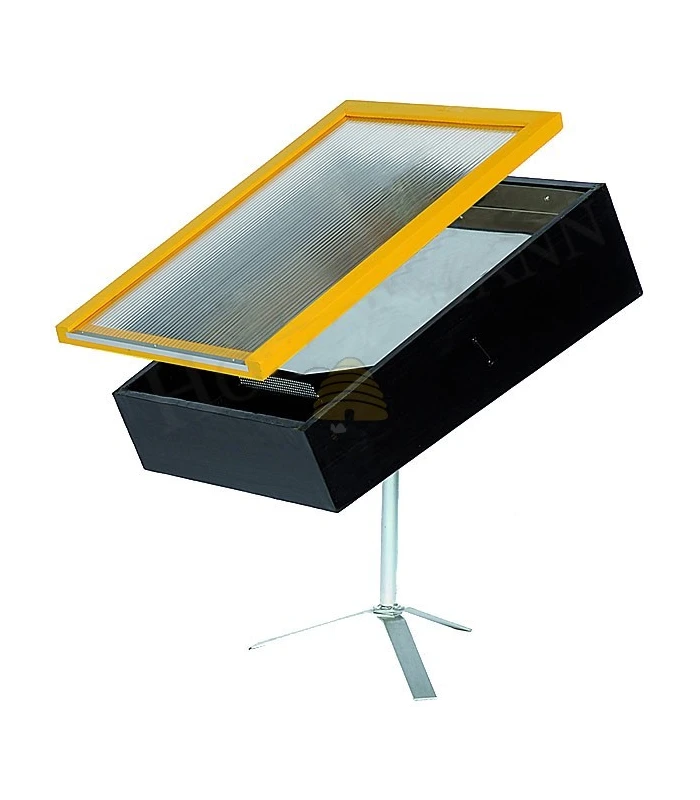 Solar wax melter 59 x 77 cm with a depth of 24 cm. The interior features a stainless steel wax tray H 52 x W 50 x D 5 cm. The exterior is made of wood. Supplied with a metal wax collection tray. At a time, 4 brood box hive frames or 6 honey super hive frames can be melted. This solar wax melter has a double-walled transparent plastic lid.
