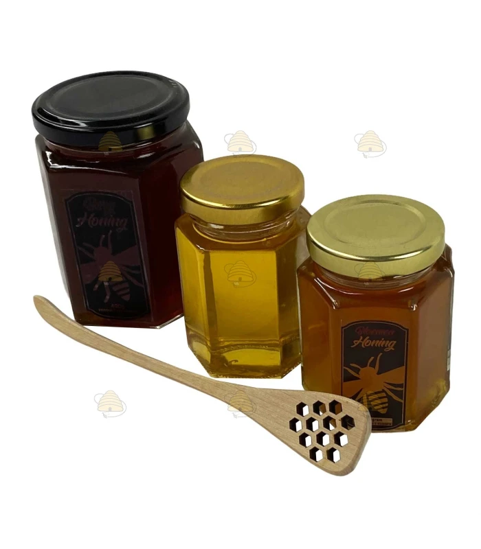 Do you love honey, but not sure which flavor you like best? Then this bundle is perfect for you! This bundle contains three different types of honey: two jars of 140 g each, one jar of 350 g, and of course a lovely honey dipper!