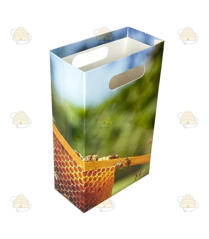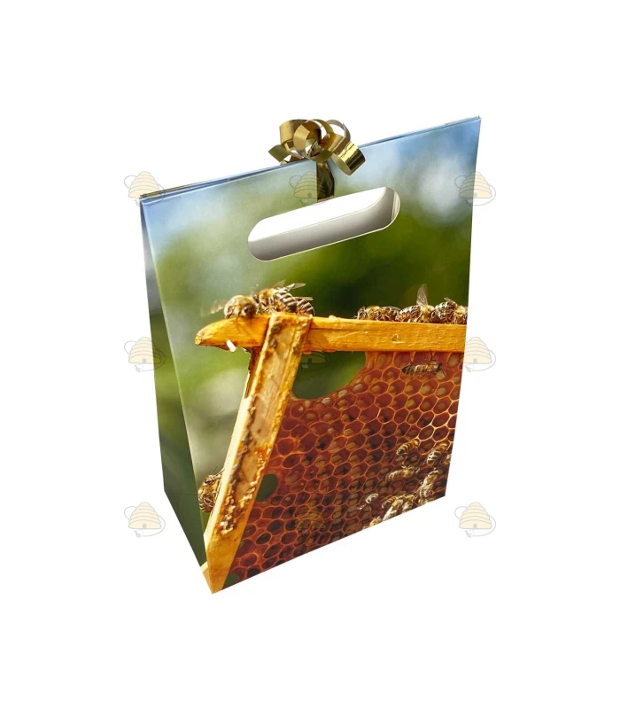 Beautiful gift bag featuring an image of a hive frame with bees. This gift bag is 30 cm high, 19 cm wide and 9.5 cm deep. The bag is made of sturdy glossy cardboard. Nice bag to use as gift packaging.