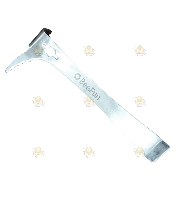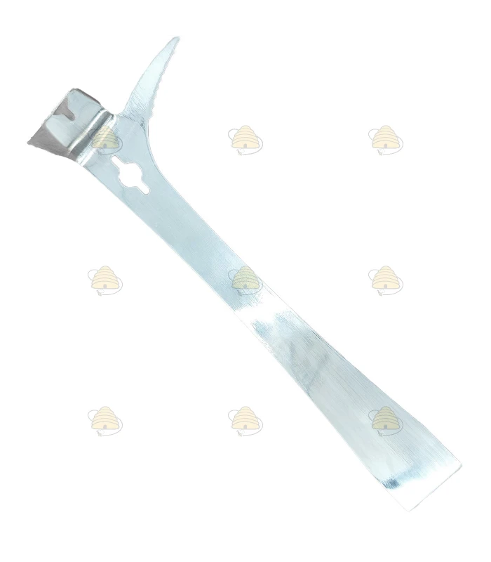Luxury silver-colored hive tool made of stainless steel (RVS/INOX), comfortable to use because it fits perfectly under the frame lugs in Dutch hives. Of course, it can be used with any other hive as well. In short, a premium hive tool that's a pleasure to use and also looks great. From the BeeFun® brand.