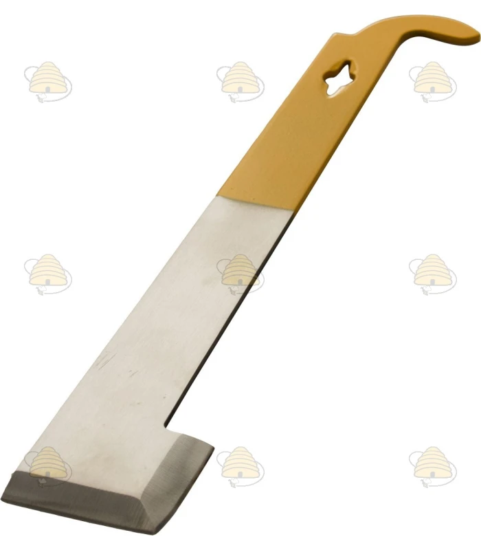 Quality hive tool made of durable stainless steel (inox). The flat end makes it easy to separate hive components. Thanks to the hook at the end, hive frames can be loosened and lifted cleanly. Lastly, the yellow color makes the hive tool stand out among other tools or in the grass. The tool is 26.5 cm long and 2-3 mm thick.