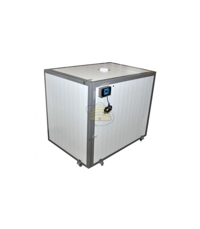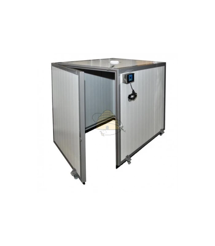 Decrystallization chamber designed for a 300 kg drum. This chamber is used to decrystallize honey, changing it from solid (crystallized) to liquid. Equipped with a heating element and a fan that ensures even heat distribution in the chamber. Thanks to the thermostat, this chamber prevents overheating the honey. The external dimensions of the chamber are l: 1535 mm, w: 1135 mm and h: 1290 mm, and the internal dimensions are l: 1300 mm, w: 910 mm and h: 1210 mm. Note: after extensive use, it is common to have the element replaced.