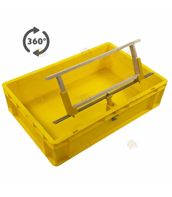 This 360° rotating frame holder on the Wendefix uncapping tray makes the uncapping process (turning the frames) easier than ever. This tray is adjustable for different frame sizes with a maximum frame length of 48 cm and a maximum end bar width of 26 mm at the bottom (Hoffmann frames also fit in this uncapping tray).
