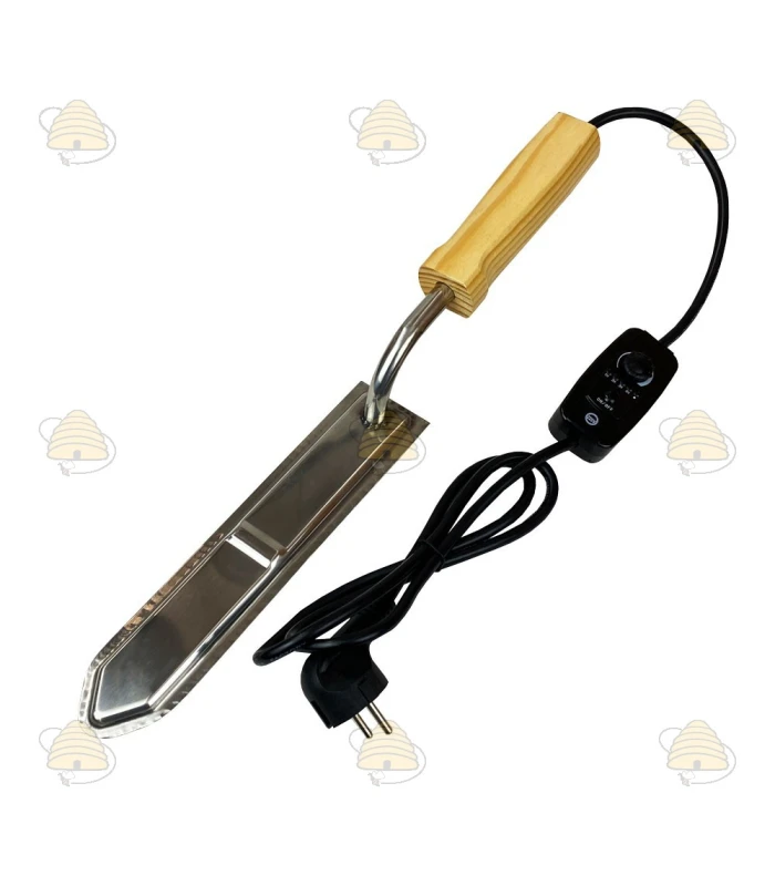 Electric uncapping knife for quick and easy uncapping of hive frames. The knife features a temperature controller with 5 settings and an on/off switch. The total length of the knife and handle is 43 cm; the blade itself is 24.5 cm long and the width is 5 cm.