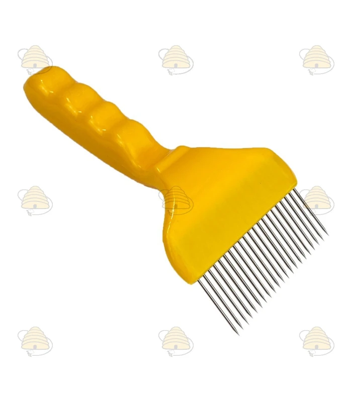 Small uncapping fork with straight tines, with an overall length of 19 cm. The plastic handle offers an excellent grip, making uncapping hive frames very easy. The uncapping fork is very sturdy and the tines are made of stainless steel.