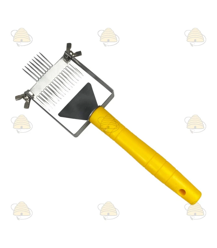 Uncapping fork with plastic handle for uncapping the honeycomb. Made of sturdy plastic with extra metal reinforcement for uncapping. Another advantage is that this uncapping fork is self-spacing. The fork head and tines are made of stainless steel. Thanks to the extremely strong tines, it is unlikely that any tine will bend.