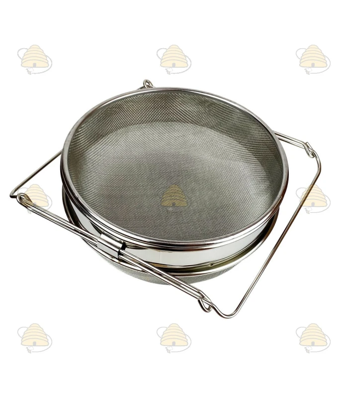 Dome-shaped honey strainer for filtering wax particles after extracting. Consisting of two sieves (coarse and fine), both dome-shaped. This way, one sieve hangs inside the bucket. The advantage is a larger surface area. Made of stainless steel and, thanks to the handy extendable arms, it fits both small and large buckets with a diameter from a minimum of 23 cm up to a maximum of 40 cm. The sieve itself has a diameter of 23 cm and hangs 5 cm above the bucket.