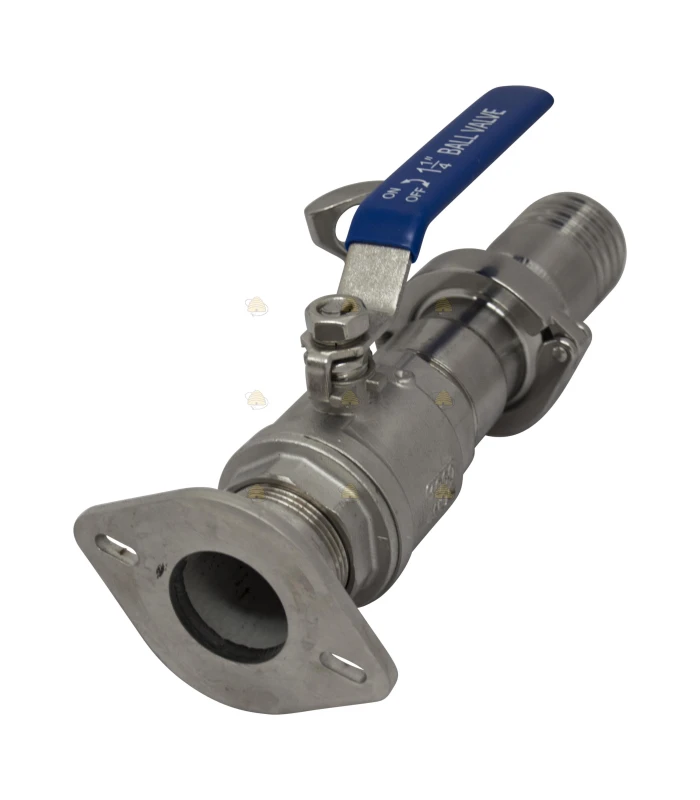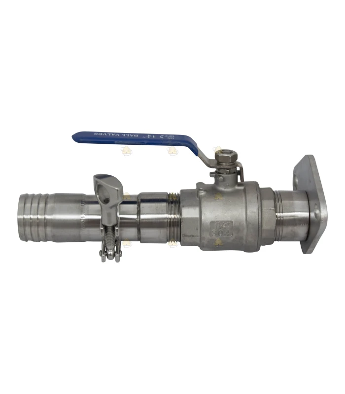 Adapter that allows various components such as a honey tank, ripener, filter, honey extractor, etc. to be fitted with a honey gate and a hose connection so they can be connected to a pump, filling machine, etc.