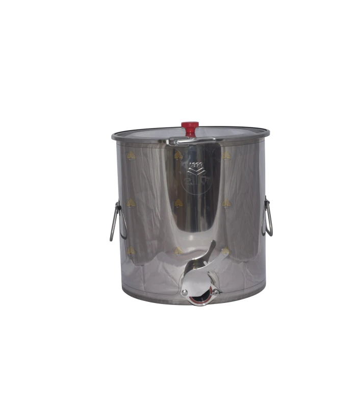 Robust Premium stainless steel honey tank, ideal for filling and/or ripening up to 50 kg of honey. This model is made of heavy-gauge stainless steel and comes with a clamp ring. Complete with lid, honey gate, and clamp ring. Height of tank 52 cm, outside diameter of lid incl. clamp ring 32.9 cm. Internal diameter of tank: 31 cm.