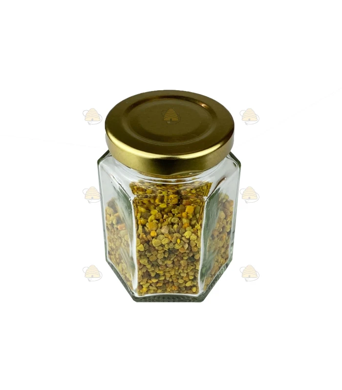 Jar with 50 g bee pollen. Bees collect pollen from flowers, add enzymes and some nectar, and form pellets that they stick to their hind legs for transport; these pellets are called bee pollen. Bees collect pollen as a protein source. This bee pollen is about 35% protein. Besides protein, it also contains carbohydrates, fats, and many minerals (potassium, magnesium, calcium, iron, phosphorus, sulfur, manganese, silicon, copper), and amino acids. But it doesn’t stop there: bee pollen contains the vitamins (B1 (thiamine), B2 (riboflavin), B3 (nicotinamide), B6 (pyridoxine), B8 (biotin), B9 (folic acid), B12), nicotinic acid, vitamin C (ascorbic acid), pantothenic acid, and, to a lesser extent, A (retinol), D (ergosterol), E (tocopherol), K (phytomenadione), and rutin. This composition makes it a very healthy addition to your diet. Our bee pollen is harvested in the Netherlands or the EU and is therefore relatively local. Give it a try and stir it into your yogurt, for example, or start the day energized with a teaspoon of bee pollen. These days, bee pollen is considered a superfood.