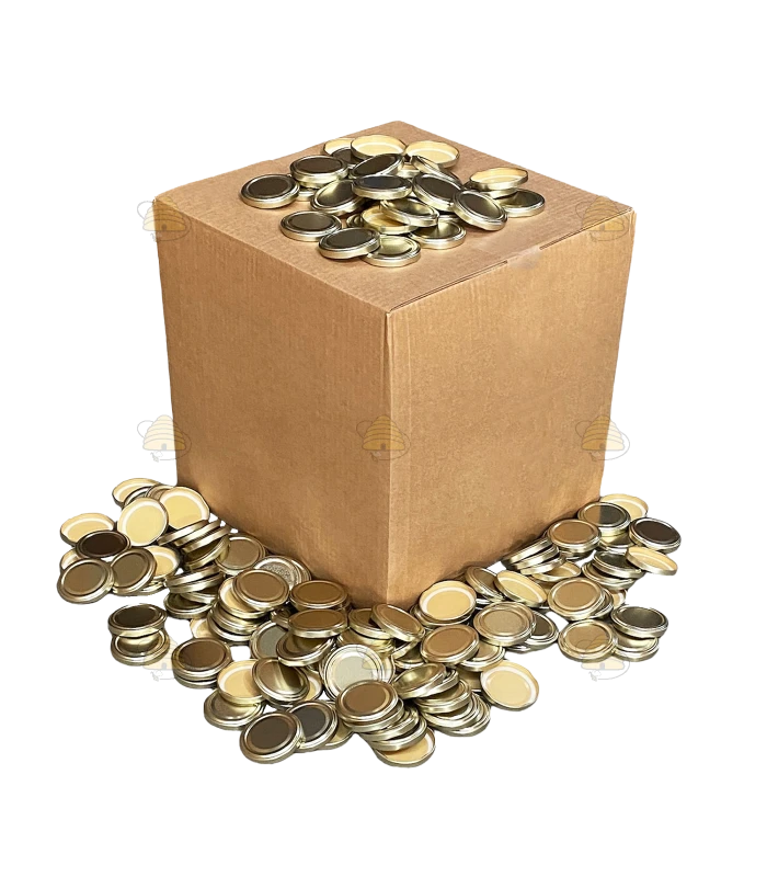 Box of gold-coloured lids, 58 mm TO, suitable for jars with a 58 mm TO closure. The lid is fitted with a click button / RSB. This allows you to vacuum-seal warm products in a jar. Once the product cools, the lid is drawn down under vacuum.
