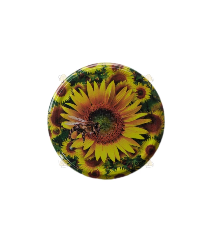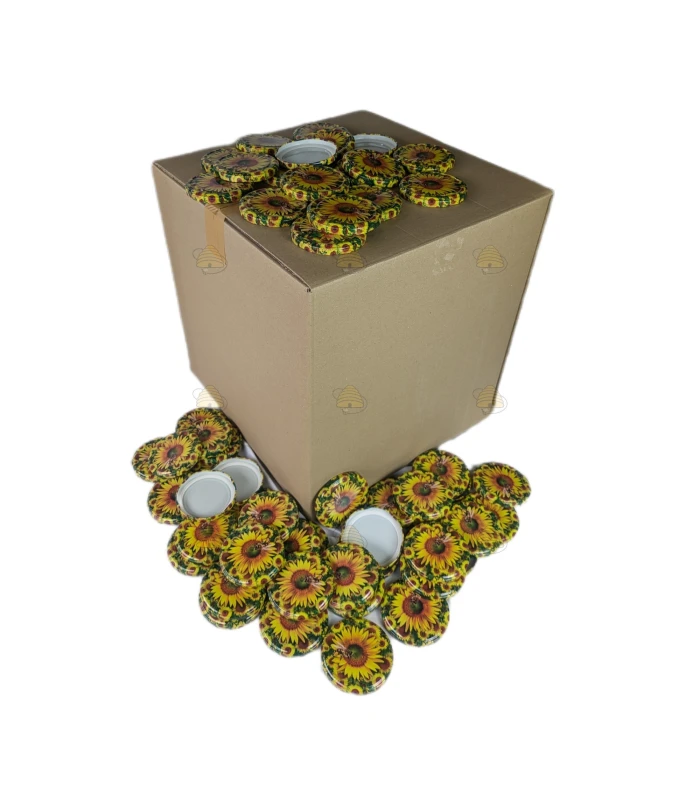 Box of 'bee on sunflower' lids, 82 mm TO, 700 pieces in total. Suitable for jars with an 82 mm TO closure. Great for finishing your jar with a lid of your choice (82 mm TO).