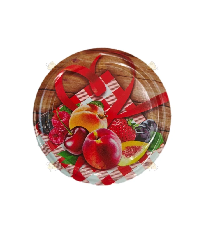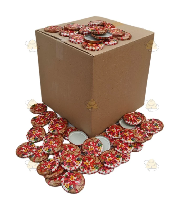 Box of jar lids, featuring a charming illustration of a picnic blanket with fruit and a heart-shaped ribbon. Lid size 82 mm TO, 700 pieces per box. Suitable for jars with an 82 mm TO closure, including the larger round jars, product 1542, for 750 grams of honey. Nice to give the jar a lid of your choice.