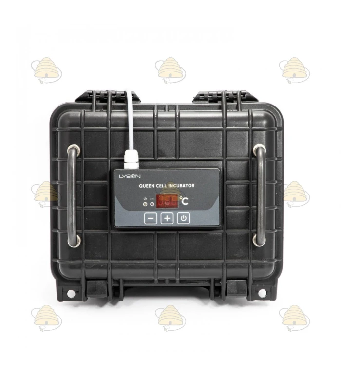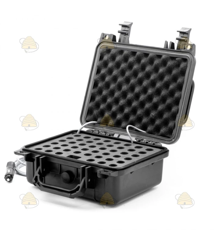 Portable incubator with 33 cells for maintaining temperature and transporting queen cells. This convenient case runs on 12V and is hermetically sealed. The case has a temperature control range of 33 - 35°C and a power rating of 30W.