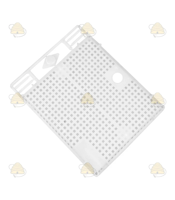 White push-in queen cage for confining the queen on a hive frame. The cage measures 14.5 x 13 cm.