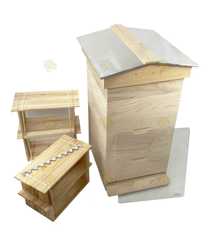Beautiful beehive for the true hobby beekeeper. The hive features an iconic peaked roof and is supplied with a glass crown board so you can easily observe the bees. The hive also includes standard simplex hive frames (linden wood, without beeswax foundation). The hive is made of pine.