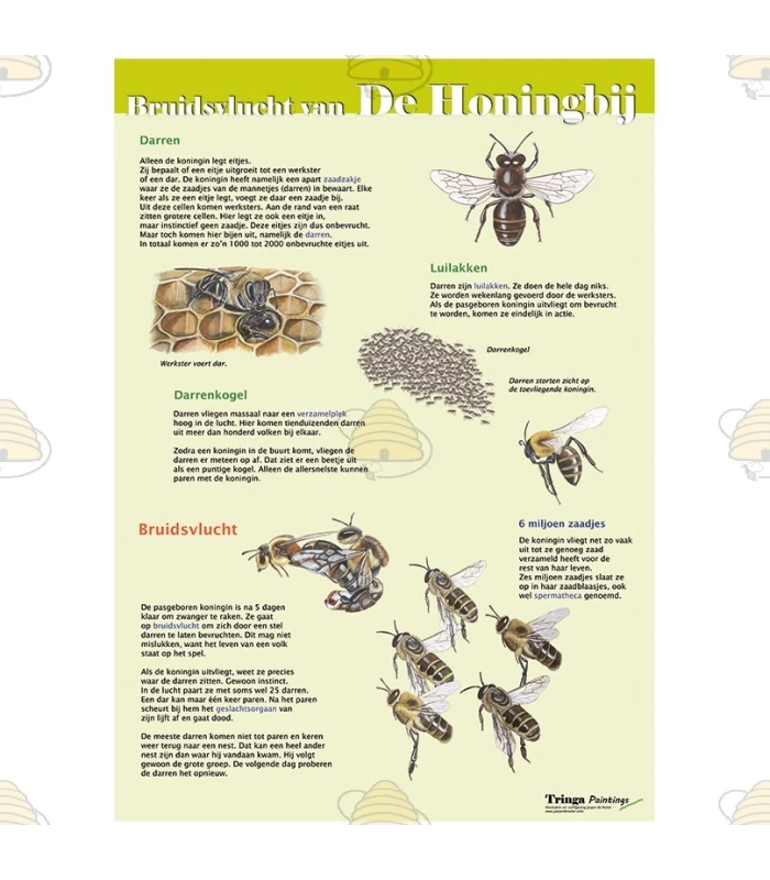 A4-size card with information about the honey bee mating flight. This card covers, among other things, the drones that go on mating flights. A beautiful illustration is printed on the back. The card comes laminated.
