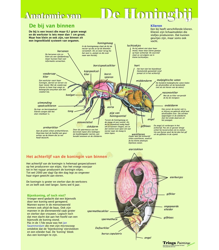 Beautiful A4 poster on the anatomy of the honey bee. With this poster you’ll get to know the bee’s body with clear, engaging information on each internal organ. The poster is laminated and features a beautiful image of the honey bee on the back.