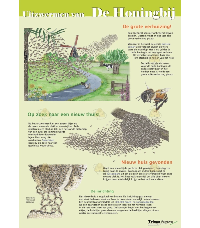 This A4 poster provides information about honey bee swarming. It explains not only why honey bees swarm, but also the steps the bees take and how the new nest site is established. This poster comes laminated and features a detailed illustration of the honey bee on the reverse side.