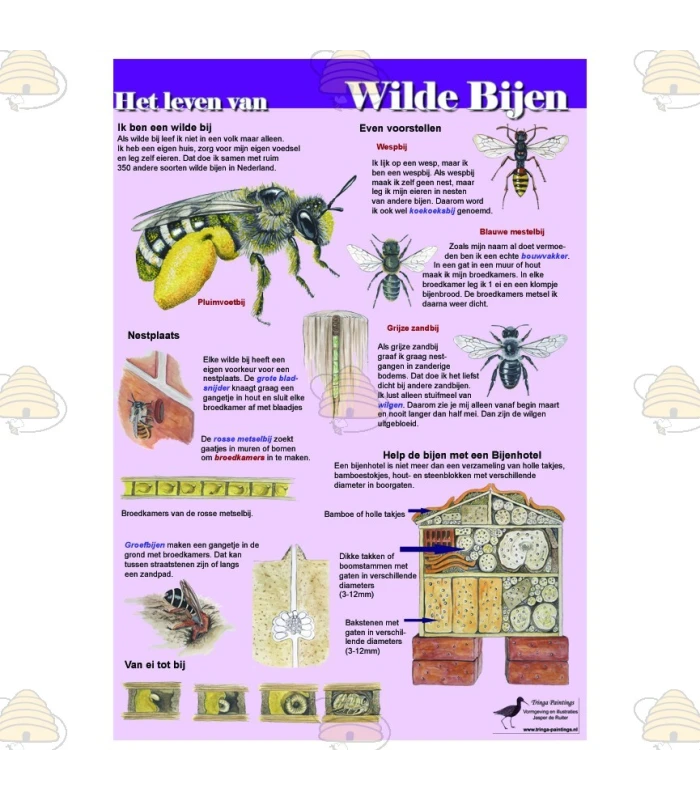 Educational chart explaining the life of wild bees. With illustrations of different wild bees such as the mason bee and the hairy-footed flower bee. Ideal for the apiary as decoration and information. Target audience: children and adults with little knowledge of bees. Supplied laminated and also available as an A1-size poster.