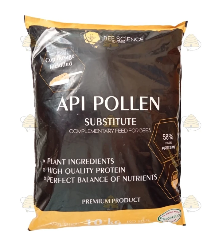 ApiPollen feed for honey bees is specially developed as a substitute for natural pollen. You can easily supplement protein in the beehive and help the bees build up during periods of pollen dearth. This will reliably improve colony development, regardless of the weather. The feed is easy to give via a frame feeder in the beehive or using a feeder silo. Choose our pollen substitute to provide your honey bees with the nutrition they need to boost their health and immunity. The bag contains 10 kg of pollen substitute. It comes with a handy scoop. This product is comparable to BeeFeed or Ultra Bee.