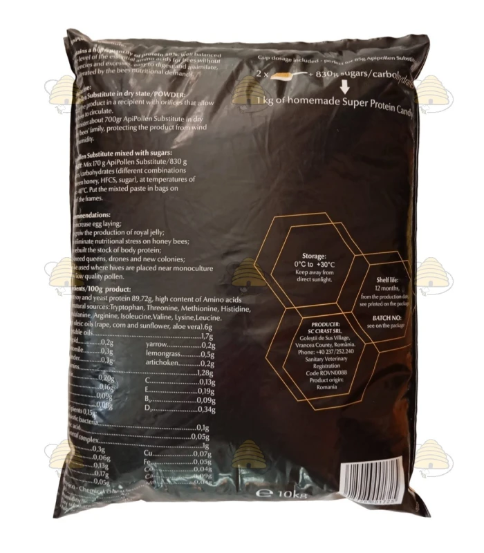 Apipollen has the advantage that the ingredients are perfectly balanced and tailored to the needs of the bees, without deficiencies or excesses. It contains: soy and yeast protein (58% pure protein), vitamins: B1, B2, B6, B12, PP, C, A, D3, E; mineral complex: Ca, Mg, Fe, Cu, Zn, Mn, Co, P, vegetable fats, essential plant oils, citric acid, antioxidants, probiotic bacteria.