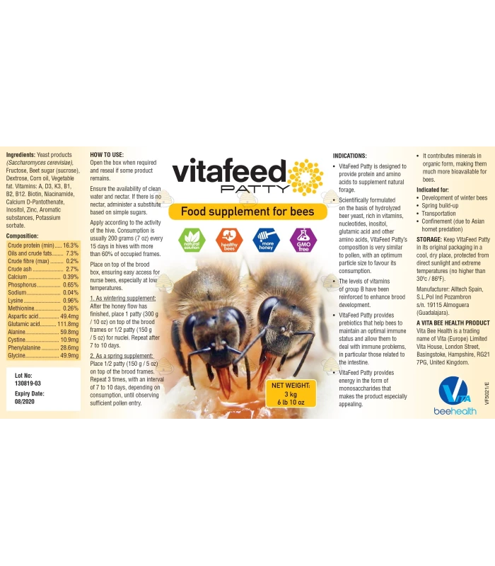 A VitaFeed Patty is a protein-rich bee supplement that boosts honey bee health, expands the brood nest, and increases honey production. For best results, use a VitaFeed Patty in autumn and spring to strengthen the colony and promote colony growth. It is rich in vitamins, nucleotides, and amino acids, specially developed for the honey bee.
