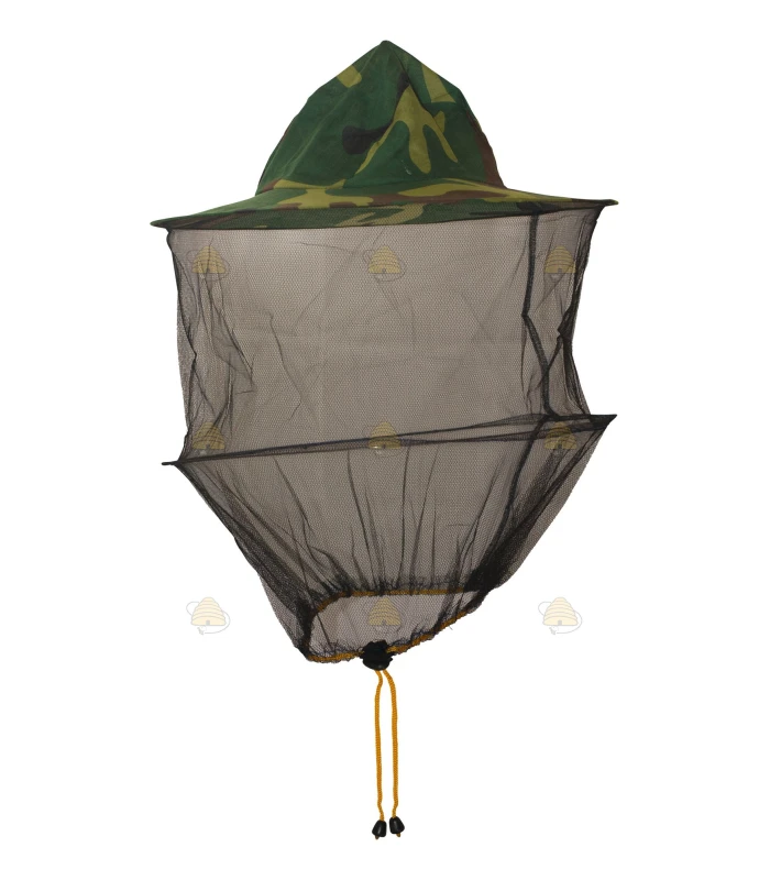 Beekeeping veil with black mesh and a lightweight fabric hat in dark green camouflage colors. Ideal for observers and/or 'guerrilla' beekeeping. The veil also features a spacer ring at shoulder height to keep the mesh away from the face.