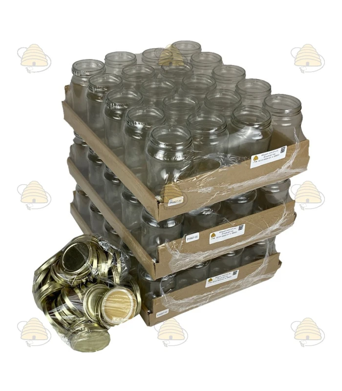 Round glass jar for 375 ml or 450 g of honey, with a gold-colored lid. 7.1 cm wide and 12.1 cm high; 12.3 cm high with lid. Lid type: TO 63 mm.