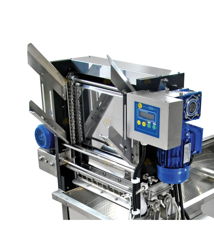 This fully automatic uncapping machine is custom-built to your specifications. This is essential because the machine is only suitable for one frame size. The capacity of the machine is 4 hive frames per minute. The hive frames are fed in and then processed automatically. The motor has a rotation speed of 9 rpm.