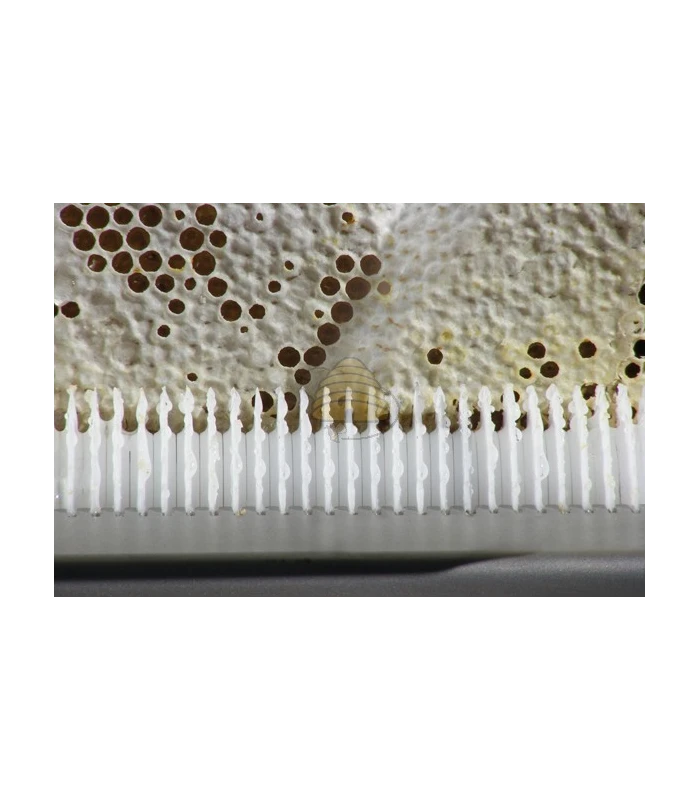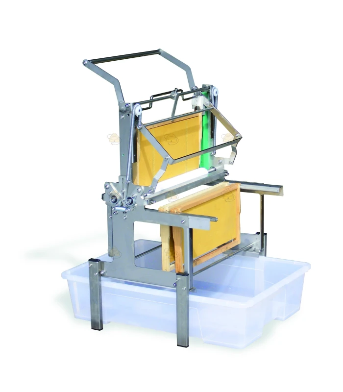 Beautiful compact uncapping machine from LEGA’s Premium line. The operation is manual, but thanks to the simple levers it’s very easy. One lever uncaps the hive frame and the other lever slides the frame through so there’s room for the next frame to uncap. A great feature of this model is that the cappings wax stays on the frames. The plastic knives cut shallow grooves in the honeycomb and barely damage the cappings. This allows the bees to reuse the wax immediately to cap the next honey crop. With this machine you can uncap up to 240 hive frames per hour. We’re happy to set up this machine for your frame size. You can also do this yourself with some technical know-how. So it’s possible to switch to another frame size. The height of this uncapping machine is about 95 cm.