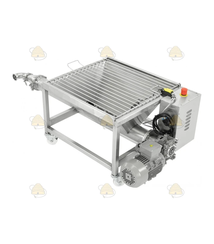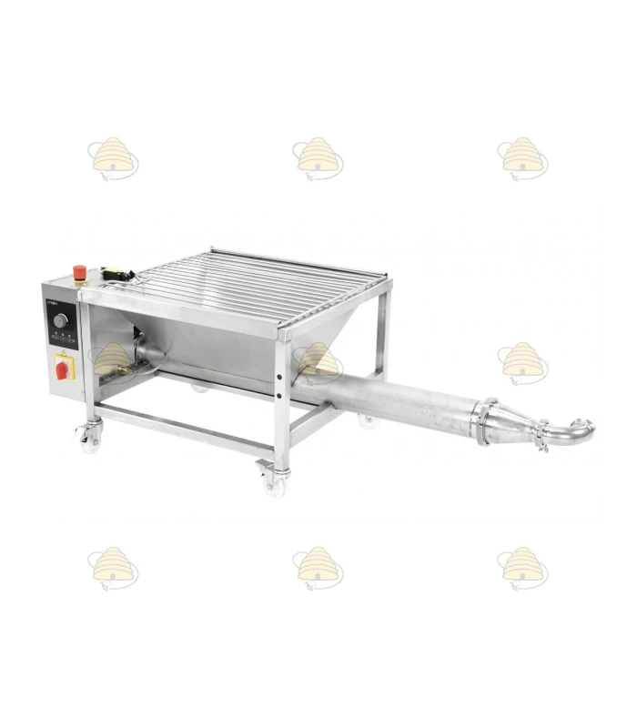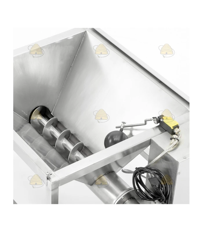 This stainless steel machine is specifically designed to be placed under an uncapping machine to transport the uncapped pieces of honeycomb to the next machine in the processing line. The pieces of honeycomb fall into the collection bin between the tube and the auger. When the auger turns (speed adjustable), the pieces of honeycomb are pushed through the tube. And the automatic float switch (see photo) ensures the collection bin never gets too full. With this machine you ensure a highly hygienic, effective and efficient honey harvest and beeswax processing!