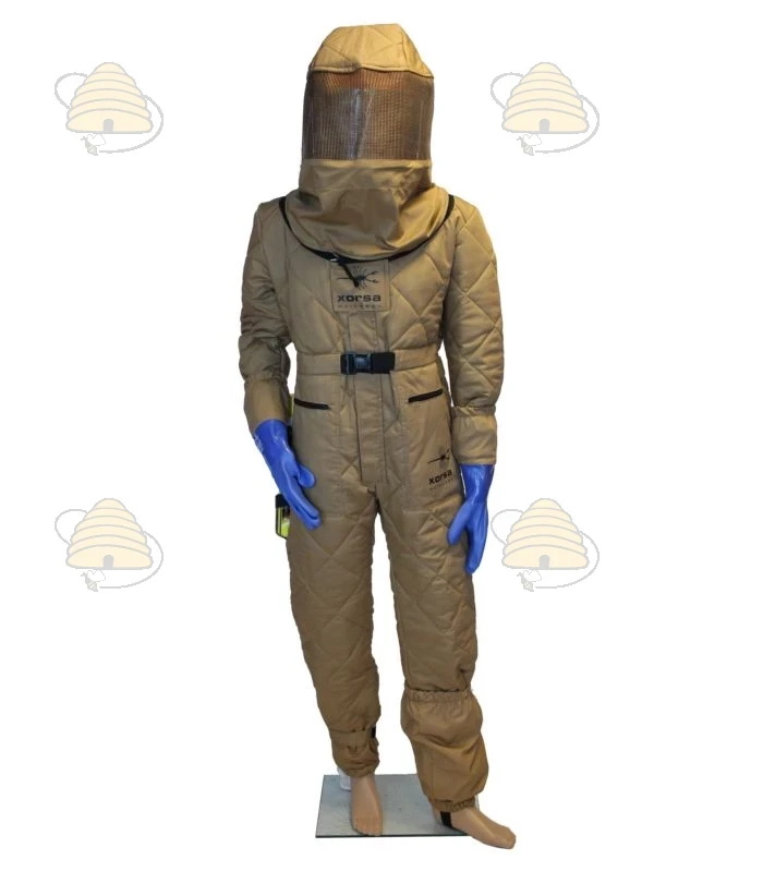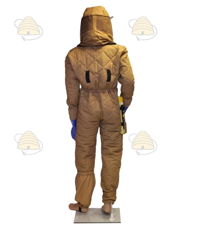 Tuta completa / tuta integrale di colore beige che garantisce un’ottima protezione dal calabrone asiatico. La tuta è dotata di tasche con cerniera ed è realizzata in un robusto tessuto a doppio strato che assicura un’elevatissima protezione. All’interno della tuta è presente un casco regolabile in plastica con visiera a rete in plastica, che mantiene sempre costante la distanza tra la rete e la testa, riducendo al minimo il rischio di punture al viso attraverso la rete. Il casco è fissato al cappuccio con rete tramite velcro. La visiera è realizzata con rete di ottima qualità e grande robustezza. Hai un campo visivo di ben 180 gradi. Il cappuccio è staccabile tramite cerniera e può quindi essere lavato separatamente.