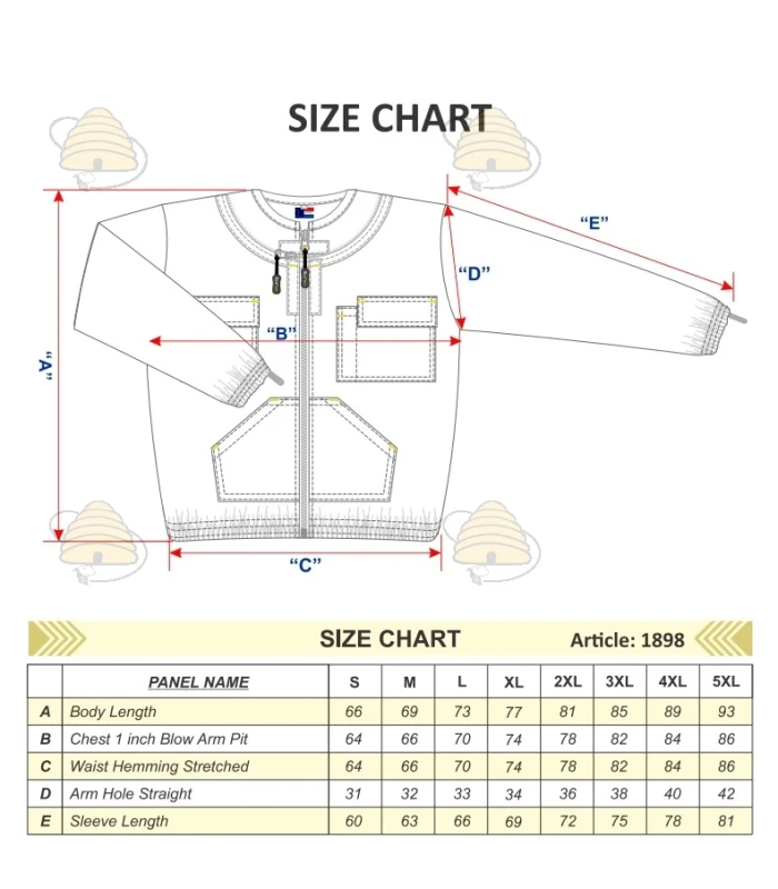 Birøkterjakke med engelsk hette, laget av tettvevd bomull. Denne birøkterjakken / birøkterdressen har seks lommer. To håndlommer foran på jakken, to brystlommer og én lomme på hvert erme. I tillegg har jakken to glidelåser: én foran på jakken og én på hetten. Dressen kan derfor tas på som en jakke. Glidelåsene er avsluttet med overlappende stoff med borrelås, slik at ingen bier kan krype inn her heller. Glidelåsene er fra YKK og varer dermed lenge. Leveres i hvitt. Hetten har også delvis solskjerm mot solen.